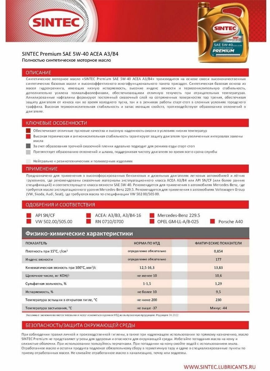 SAE viscosity grade: 5W-40, oil type: synthetic, fuel type: gasoline, diesel, API standard: CF, SL, SN, ACEA standard: A3/B4