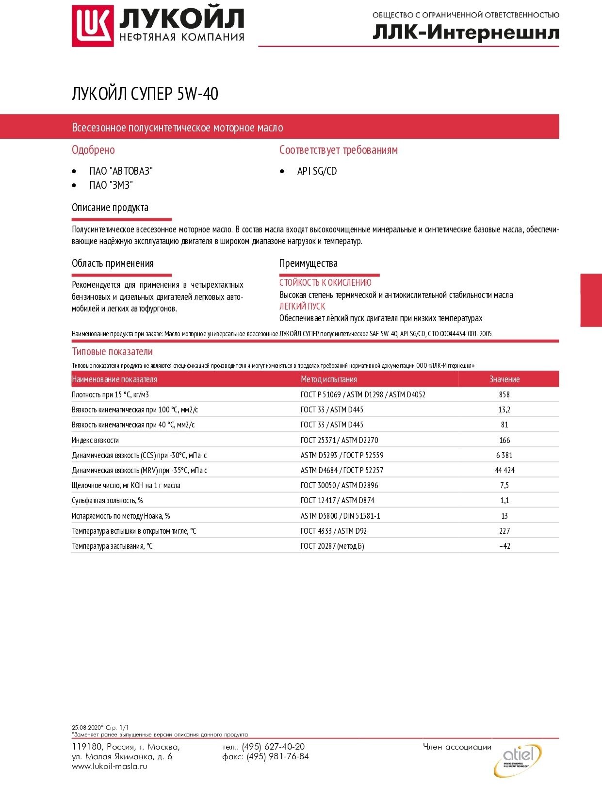 SAE viscosity grade: 5W-40, oil type: semi-synthetic, fuel type: gasoline, diesel, API standard: CD, SG, OEM approvals: AvtoVAZ PJSC, engine type: four-stroke