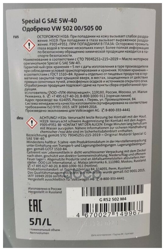 SAE viscosity grade: 5W-40, oil type: synthetic, fuel type: gasoline, diesel, API standard: GF-5, OEM approvals: VW 502.00/505.00, engine type: four-stroke