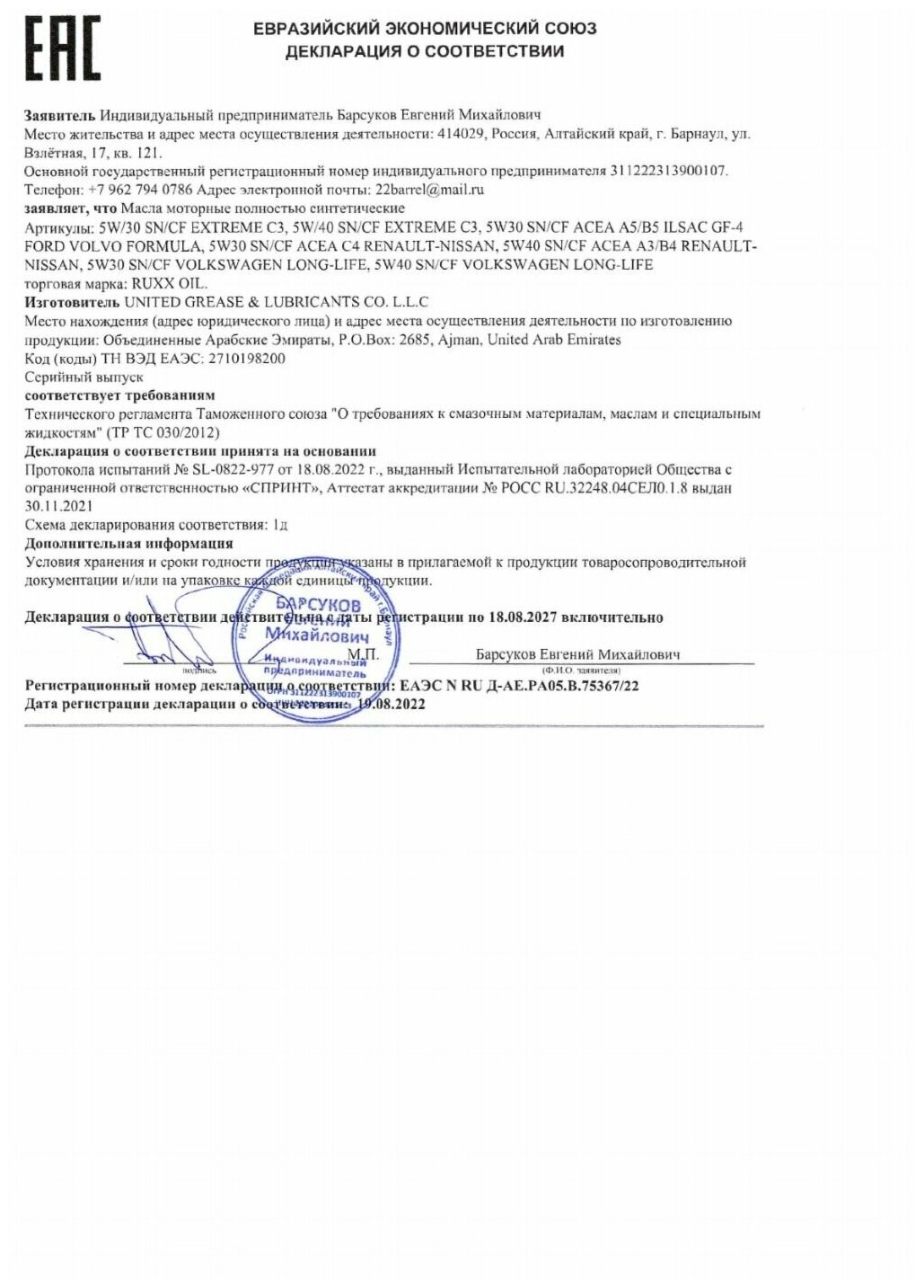 RUXX OIL NISSAN RENAULT 5W30 SN/CF ACEA C4