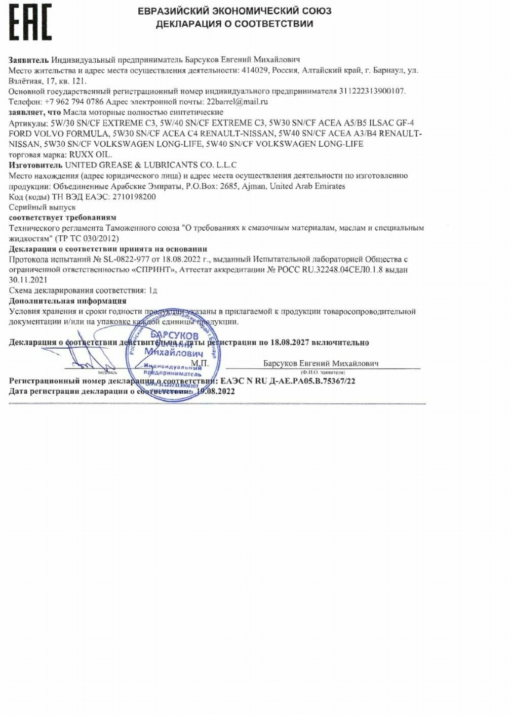 RUXX OIL VOLKSWAGEN LONG LIFE 5W30 API SN/CF ACEA C3