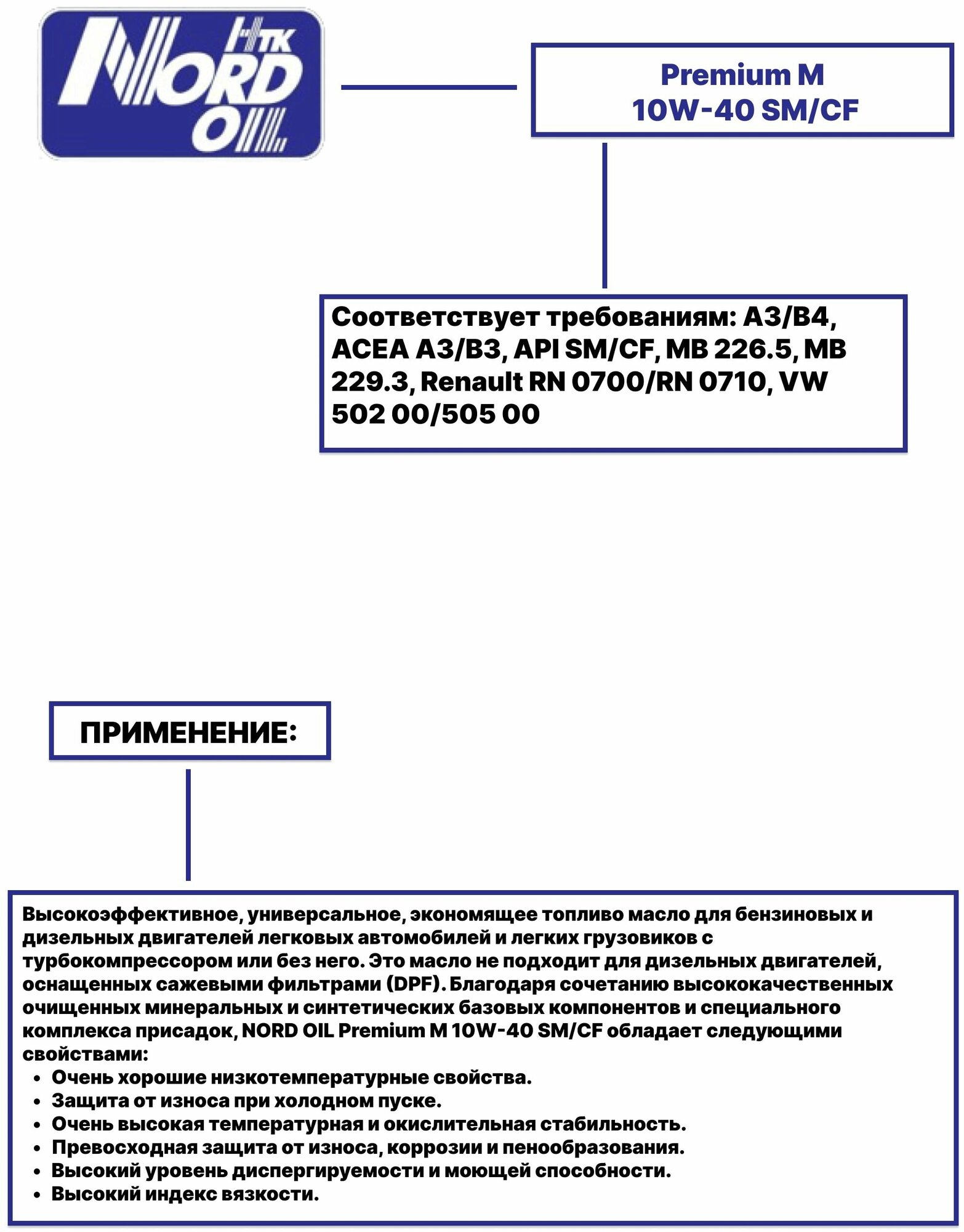 SAE viscosity grade: 10W-40, oil type: synthetic, fuel type: gasoline, diesel, API standard: CF, SM, OEM approvals: MB 226.5, MB 229.3, VW 502.00/505.00, engine type: four-stroke, for turbocharged engines