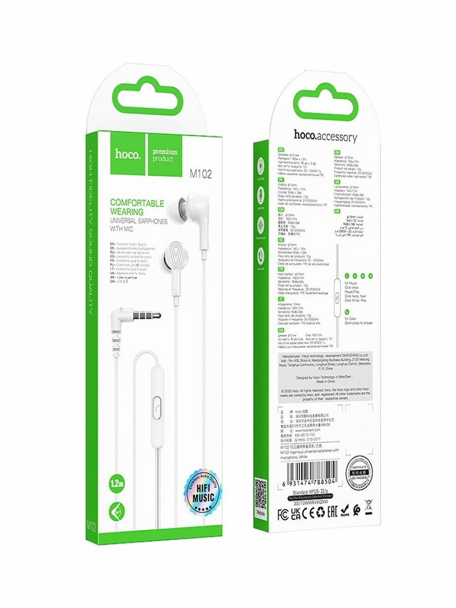 Vacuum headphones Hoco M102 are comfortable and easy to use, have a cable length of 1.2 m. Equipped with volume control and microphone