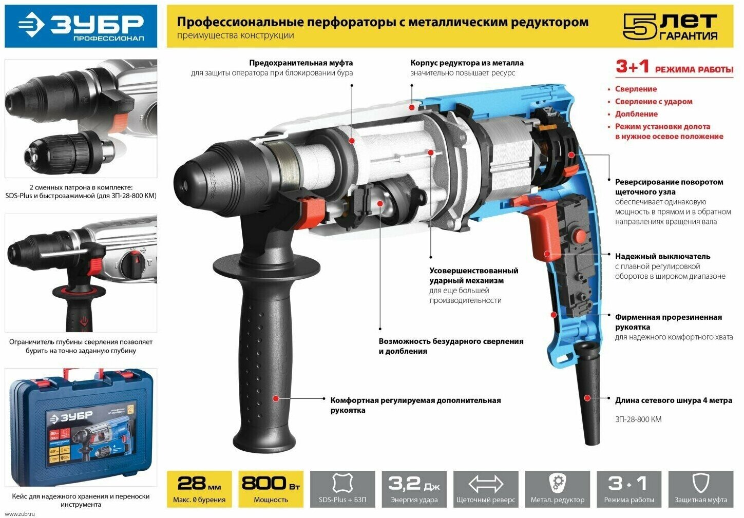 Additional handle, drilling depth limiter, safety clutch
