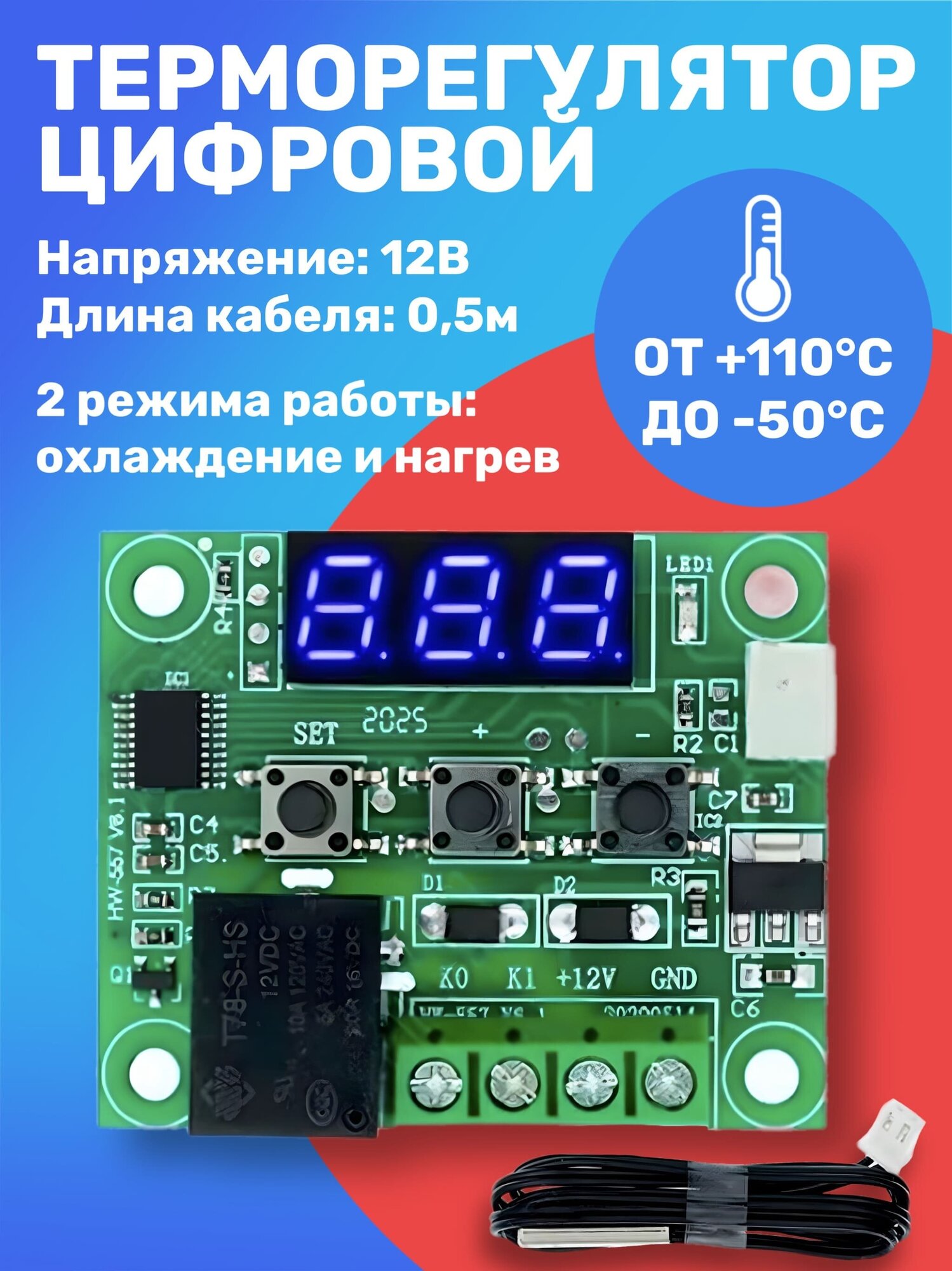 Thermostat thermostat temperature controller with display and remote sensor TECHMETR W1209 blue indication 12V, 0.5 m Green