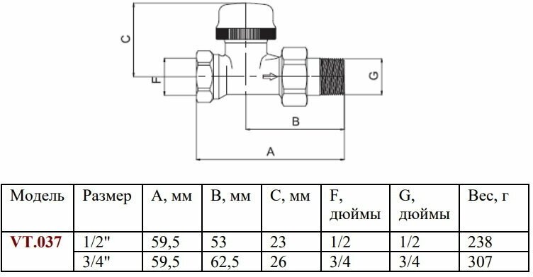 Thermostatic valve VALTEC straight 3/4 with presetting VT.038. N.05