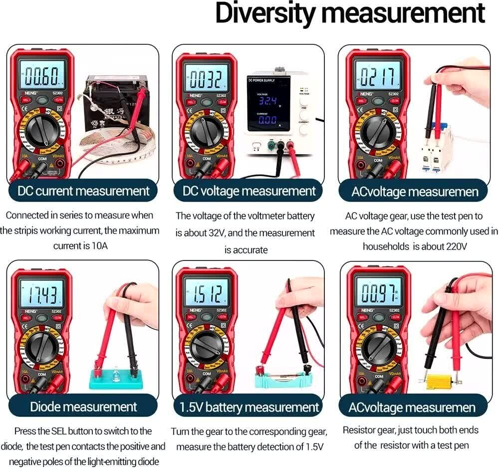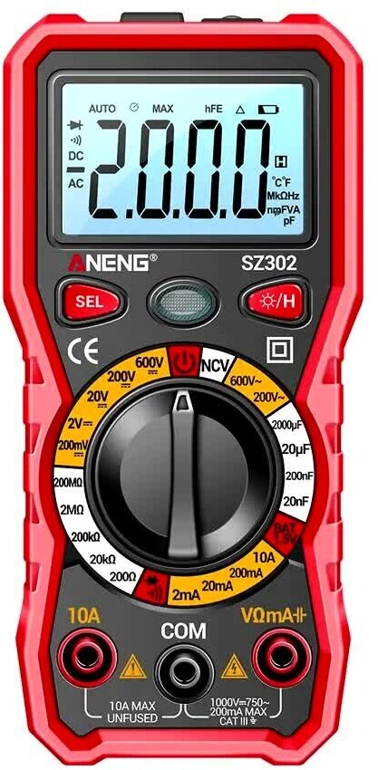 Type: multimeter, device type: digital, functions: detecting damage to wiring and connections, measuring capacitance of capacitors, measuring DC voltage, measuring DC current, measuring resistance