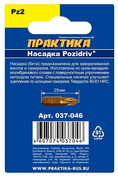 Screwdriver bit PRACTICE Expert PZ-2 x 25mm Tin 1pc, blister 037-046