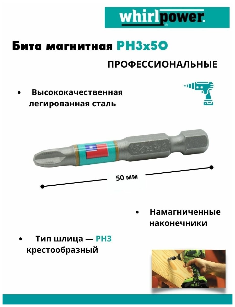 Magnetic bit set 10 pcs RN3x50 for heavy loads WHIRLPOWER for a screwdriver, for a drill