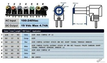 Type: for laptop, compatibility: universal, connectors: 5.5 x 1.7 mm, 5.5 x 2.1 mm, 5.5 x 2.5 mm, output voltage: 18 V, 20 V, power: 90 W, max. current: 4.80 A, features: short circuit protection, overload protection,