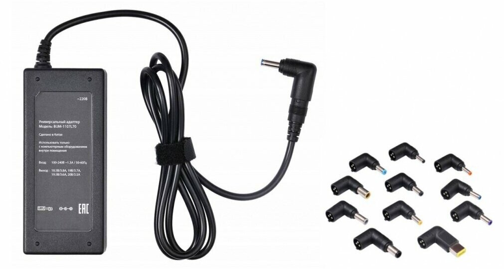 Type: laptop, compatibility: universal, connectors: 4.0 x 1.35 mm, 4.0 x 1.7 mm, 4.5 x 3.0 mm, 4.8 x 1.7 mm, 5.0 x 3.0 mm, 5.5 x 1.7 mm, 5.5 x 2.5 mm, 6.5 x 4.4 mm , 7.4 x 5.0 mm, 7.9 x 5.4 mm, output voltage: 18.5 V, 19 V, 19.5 V, 20 V, power: 70 W, max.