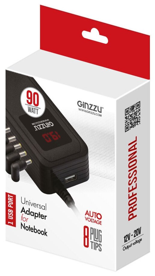 LED output voltage indicator; USB port 2.1 A for charging mobile devices; adapters: 6.3x3mm, 15V; 5.5x2.5mm, 16V; 6.5x4.5mm, 16V; 4.8x1.7mm, 18.5V; 5.5x2.5mm, 19V; 5.0x3.2mm, 19V; 6.5x4.5mm, 19.5V; 5.5x1.7mm, 19V
