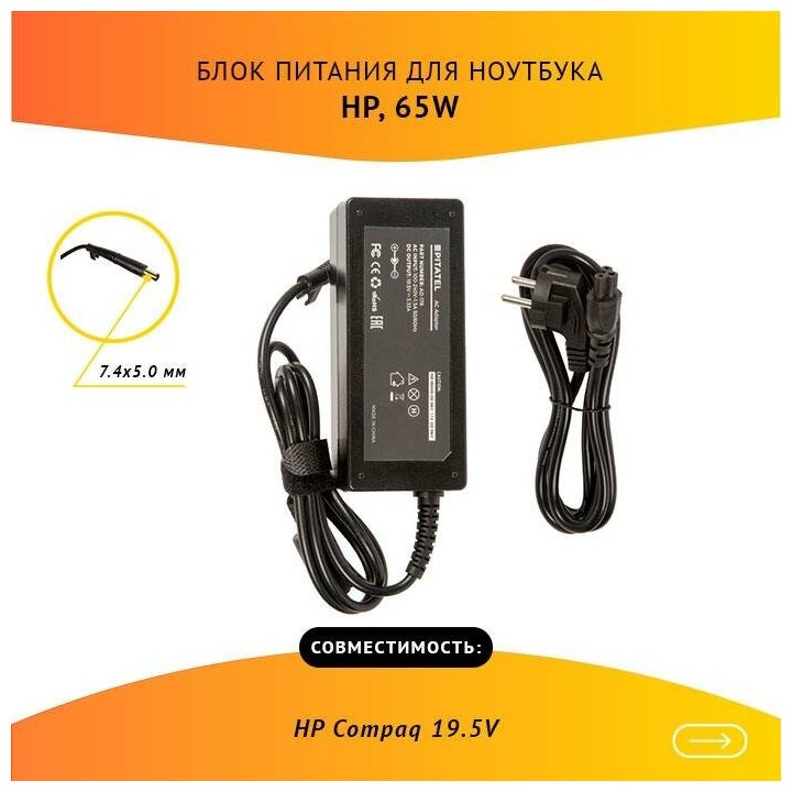 Type: laptop, compatibility: HP, HP Compaq, connectors: 7.4 x 5.0 mm, output voltage: 19.5 V, 19.5, power: 65 W, max. current: 3.33A, features: short circuit protection, overload protection, overvoltage protection
