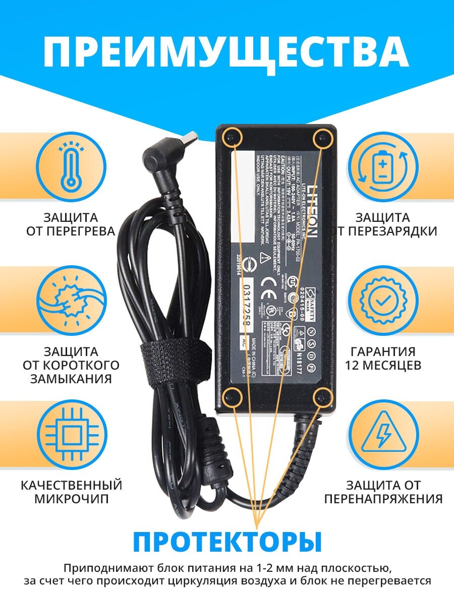 Type: laptop, compatibility: Acer, connectors: 5.5 x 1.7 mm, output voltage: 19 V, power: 65 W, max. current: 3.42A, features: short circuit protection, overload protection, overvoltage protection