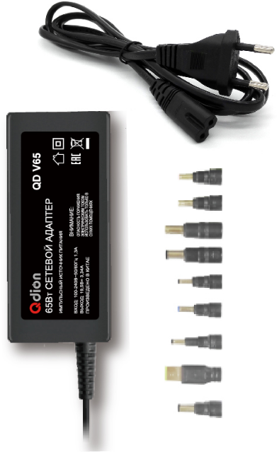 Type: laptop, compatibility: ASUS, Acer, Fujitsu, HP, LG, Lenovo, Samsung, Toshiba, connectors: 4.0 x 1.35 mm, 4.8 x 1.7 mm, 5.5 x 1.7 mm, 5.5 x 2.5 mm, 5.5 x 3.0 mm, 7.4 x 5.0 mm, output voltage: 19.5 V, power: 65 W, max. current: 3.34 A