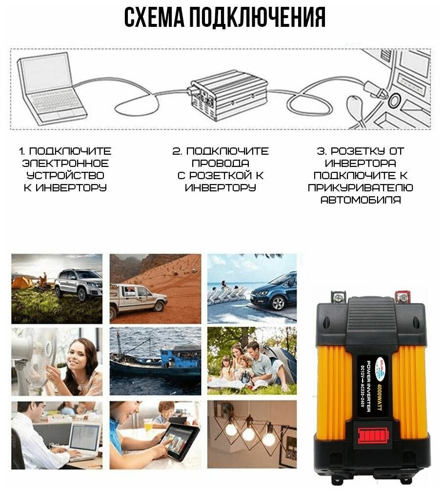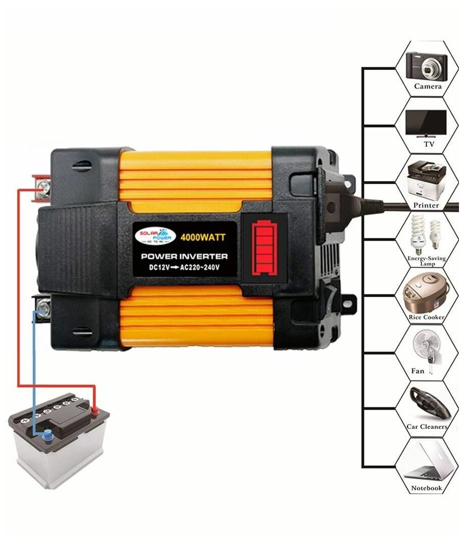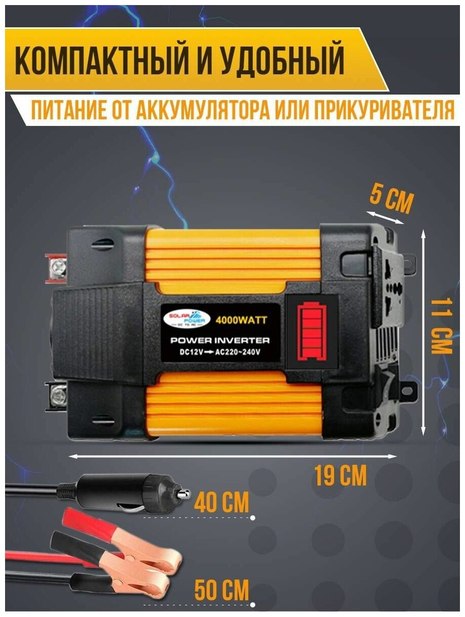 Inverter, 500 W, waveform: approximate sine wave, 2 USB, battery connection: cigarette lighter, input. voltage: 12V, 14V output. voltage: 220V, short circuit protection, over temperature protection, overload protection, overvoltage protection, low battery