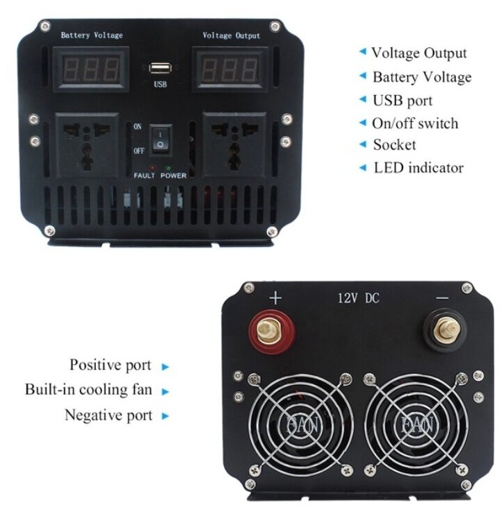 Voltage converter, 3500 W, waveform: sine wave, 1 USB, battery connection: terminals, alligator clips, input. voltage: 24V output. voltage: 220V