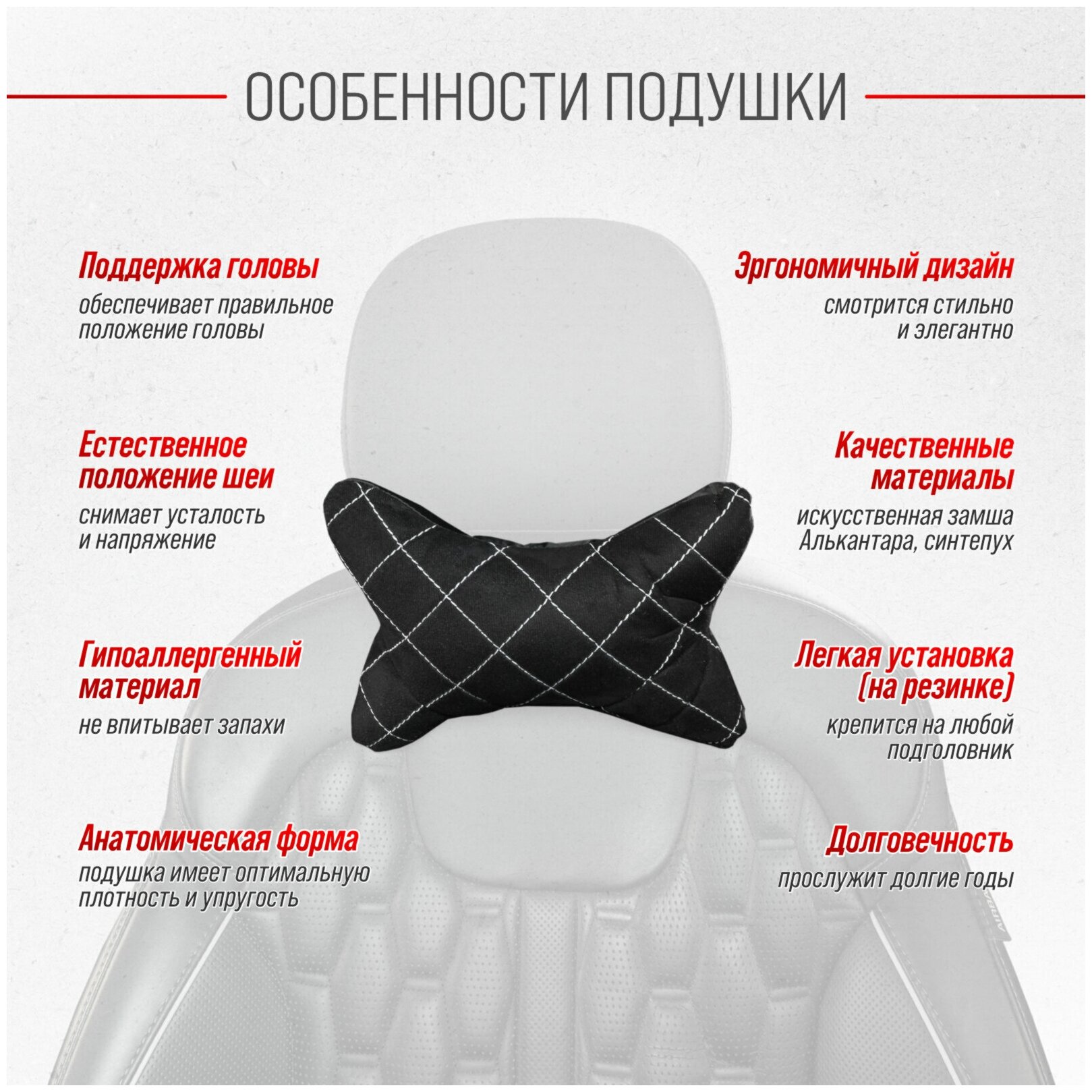 Purpose: for headrest, length: 26 cm, width: 26 cm, cover material: artificial suede, filling material: synthetic down, features: anatomical