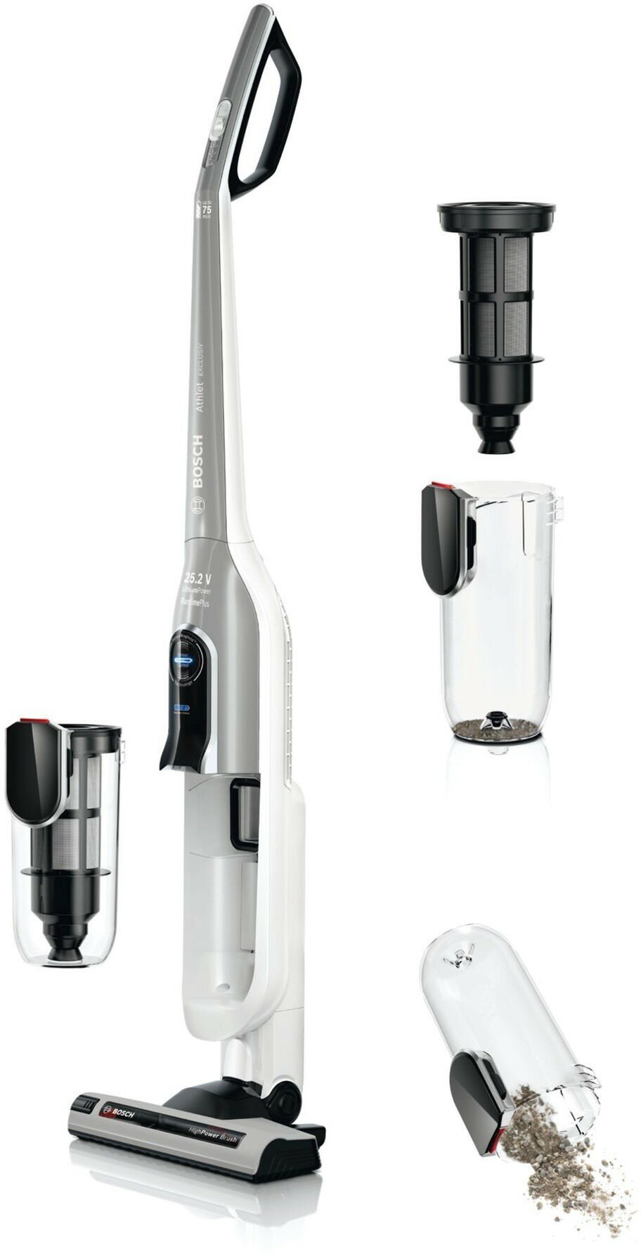 Vertical parking, dust bag full indicator, shoulder strap, power control on the handle