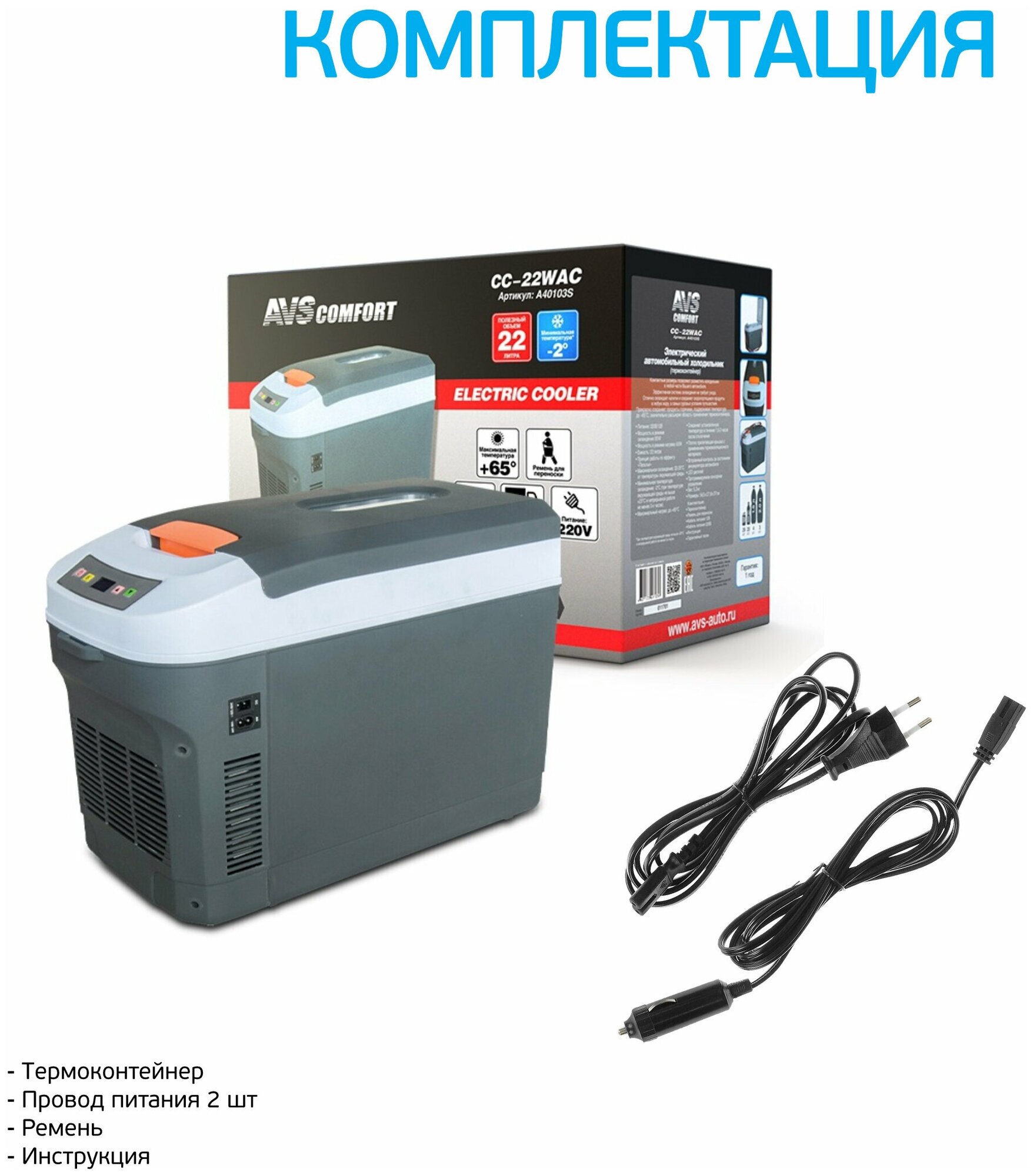 Type: container, principle of operation: thermoelectric, power supply: from the cigarette lighter, from the network, From the car network 12V, From the network 220V, voltage: 12 V, 220 V, 24 V, volume: 22 l, material: plastic, height: 37 cm , width: 50 cm