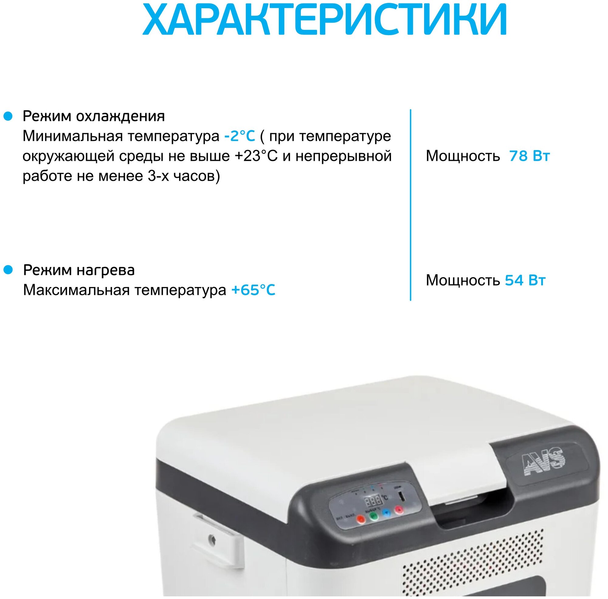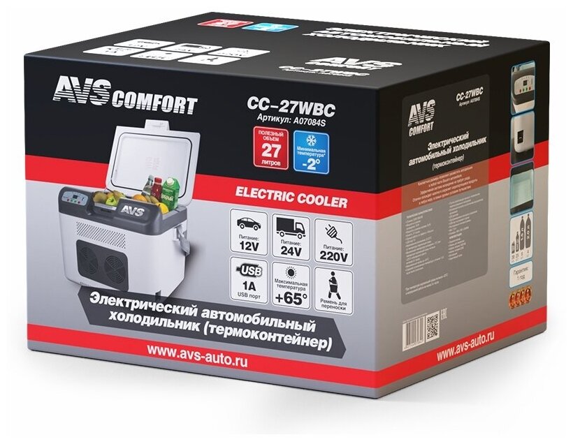 Type: container, principle of operation: thermoelectric, power supply: from the cigarette lighter, from the mains, From the car network 12V, From the mains 220V, voltage: 12 V, 220 V, 24 V, volume: 27 l, features: carrying handles, material: plastic, heig