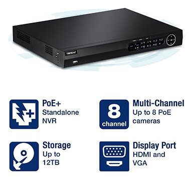 Type: NVR network, recording type: digital, PoE network connection: 802.3 af PoE, 802.3 at PoE+, number of hard drive bays: 2, Number of LAN ports: 1, Number of PoE ports: 8