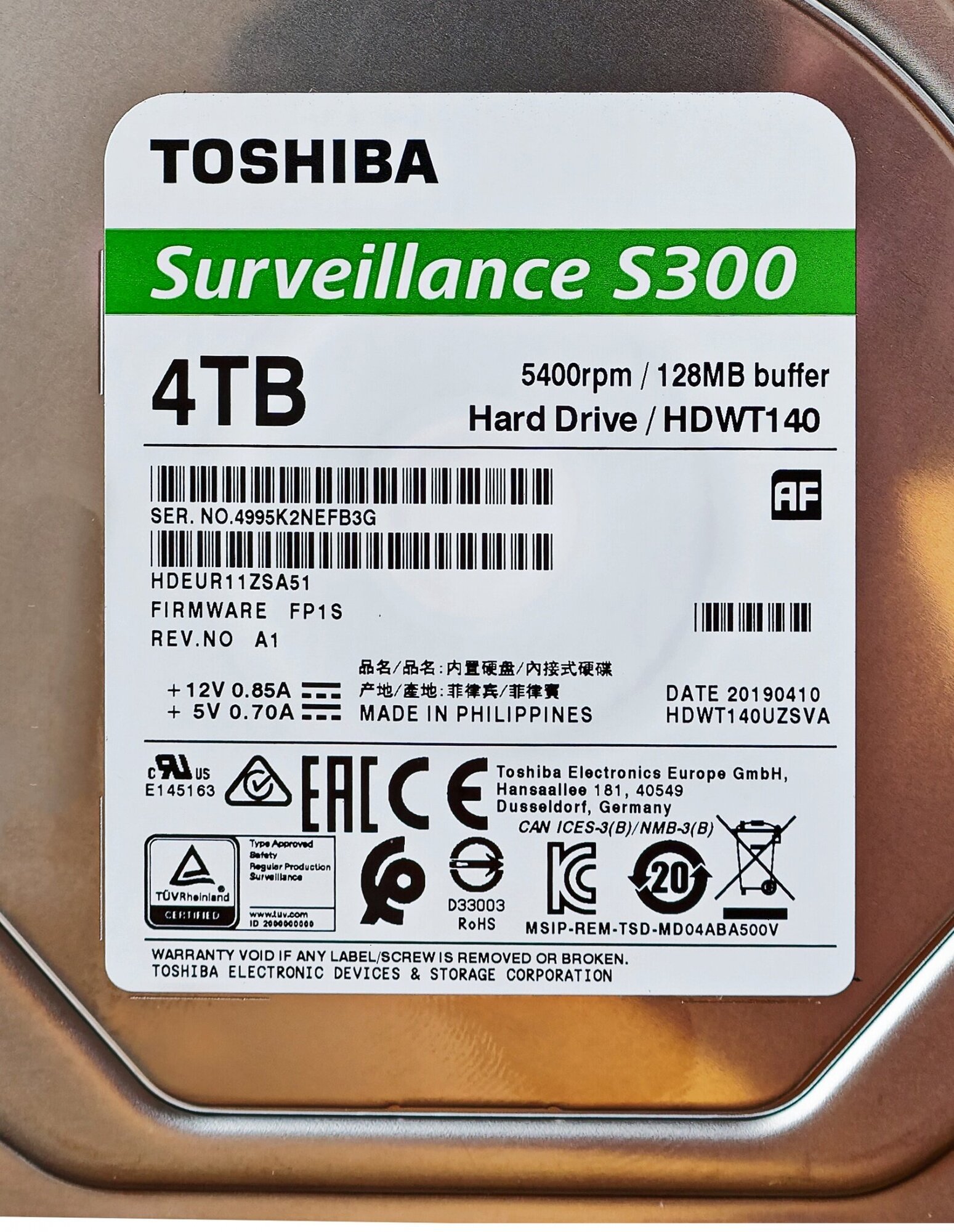 Capacity: 4000 GB, form factor: 3.5", purpose: for video surveillance systems, type: HDD, rotation speed: 5400 rpm, interfaces: SATA 6Gb/s, features: NCQ, support for 4 KB sectors