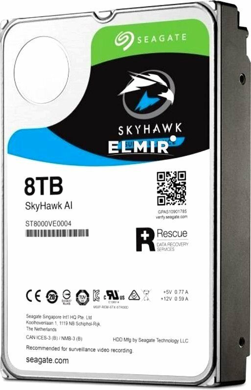 Capacity: 8000 GB, form factor: 3.5", purpose: for video surveillance systems, type: HDD, rotation speed: 7200 rpm, interfaces: SATA 6Gb/s, features: support for 4 KB sectors