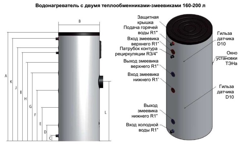 The possibility of installing a heating element; maximum heat exchanger power: 66.5 kW; Max. water pressure: 8 atm; heating temperature limitation; number of heat exchangers: 2; recirculation line inlet
