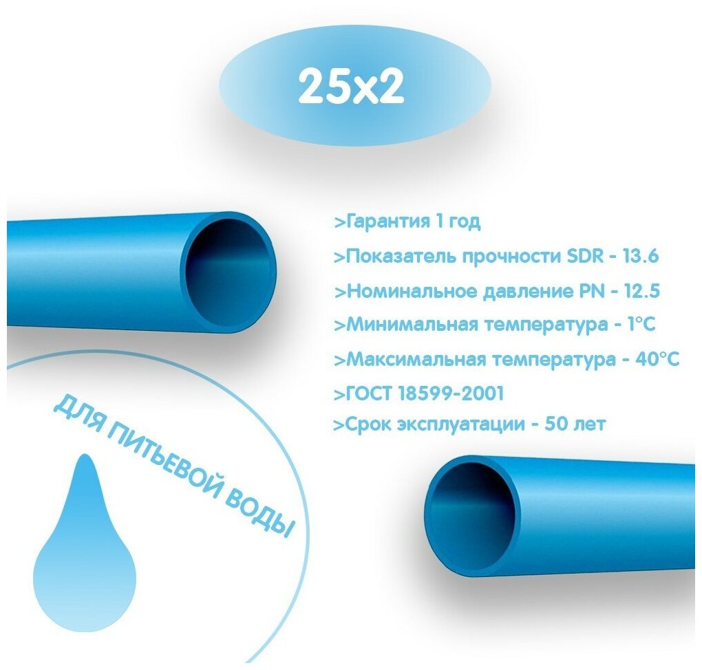 Pipe type: smooth, scope: water supply, water supply type: hot/cold, drinking water, technical, cold, pipe material: HDPE, maximum pressure, bar: PN 10, maximum temperature: 40 °C