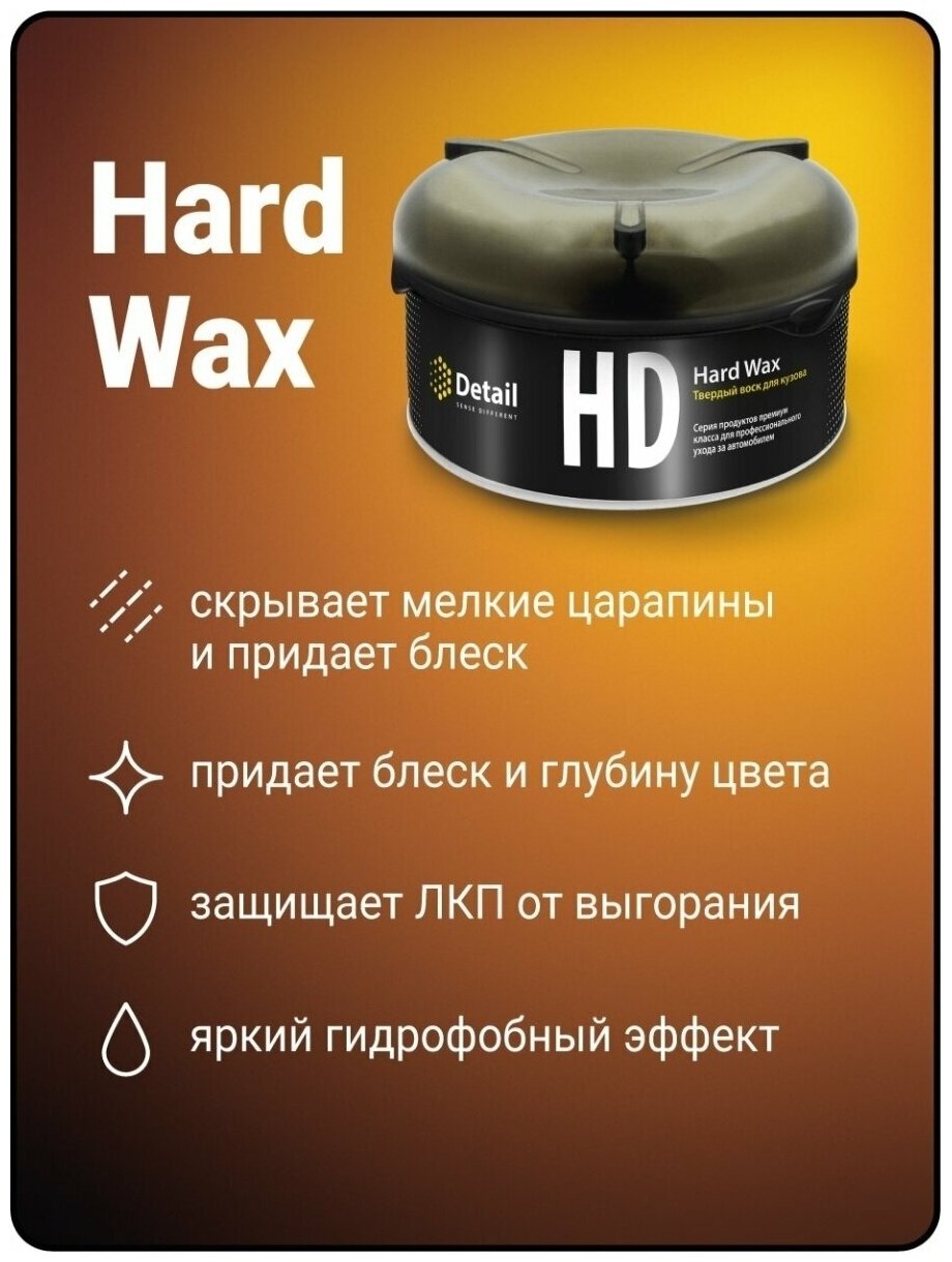 Type: hard, cold wax, action: anti-static effect, water-repellent effect, fills in small scratches, protects the paintwork, protects against UV radiation, adds shine, speeds up the drying process, wax base: animal