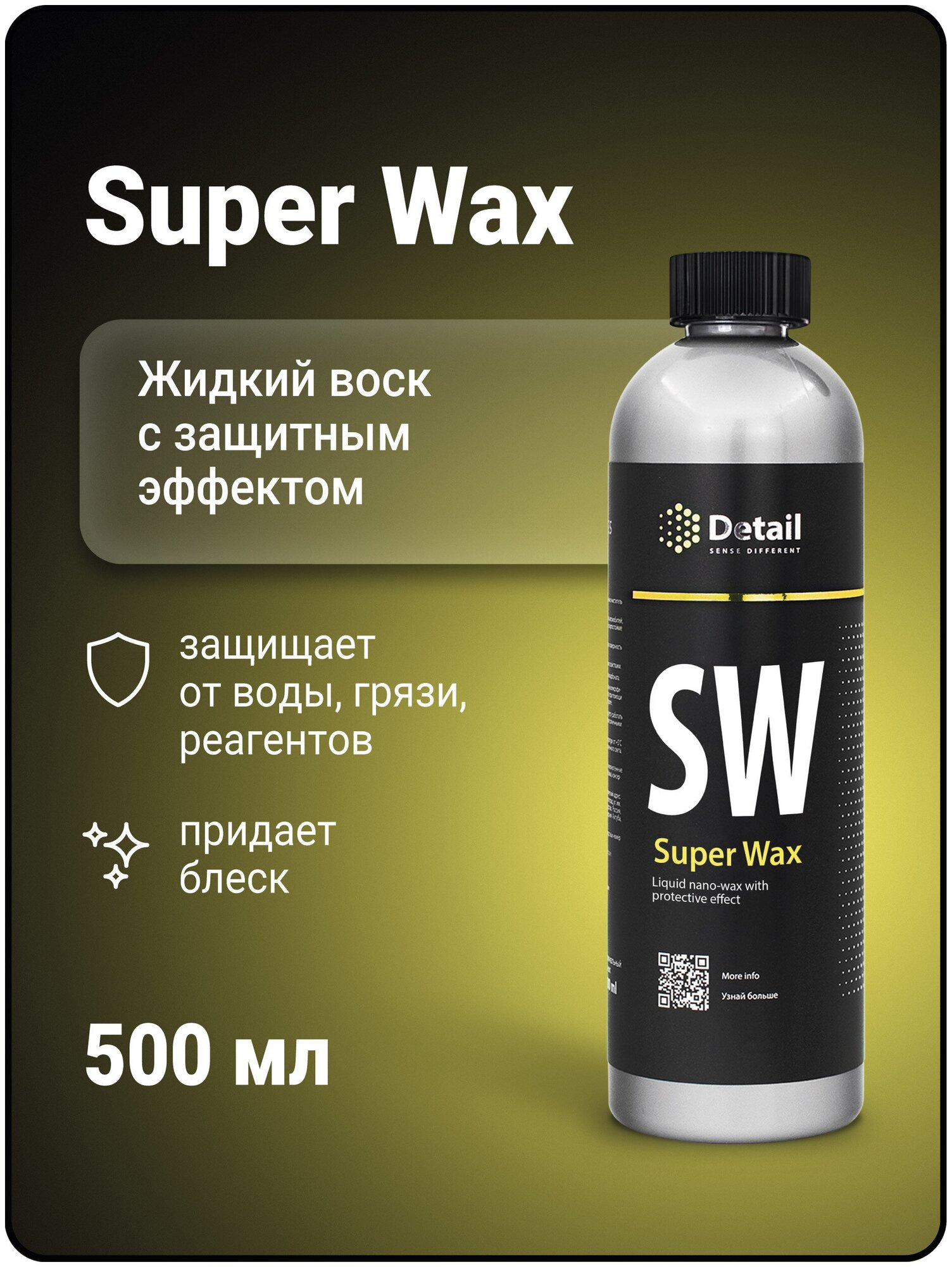 Anti-static effect, water-repellent effect, fills small scratches, protects the paintwork, protects against ultraviolet radiation, adds shine, speeds up the drying process