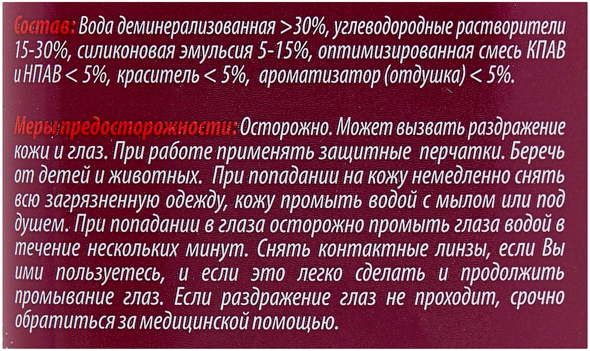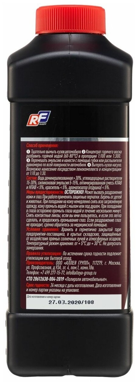 Type: liquid, concentrate, hot wax, action: antistatic effect, adds shine, accelerates the drying process, wax base: paraffin