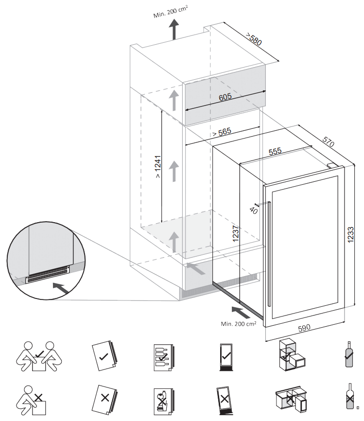 Built-in wine cabinet, 230l, 1-chamber, 55.5x57x123.7cm, black