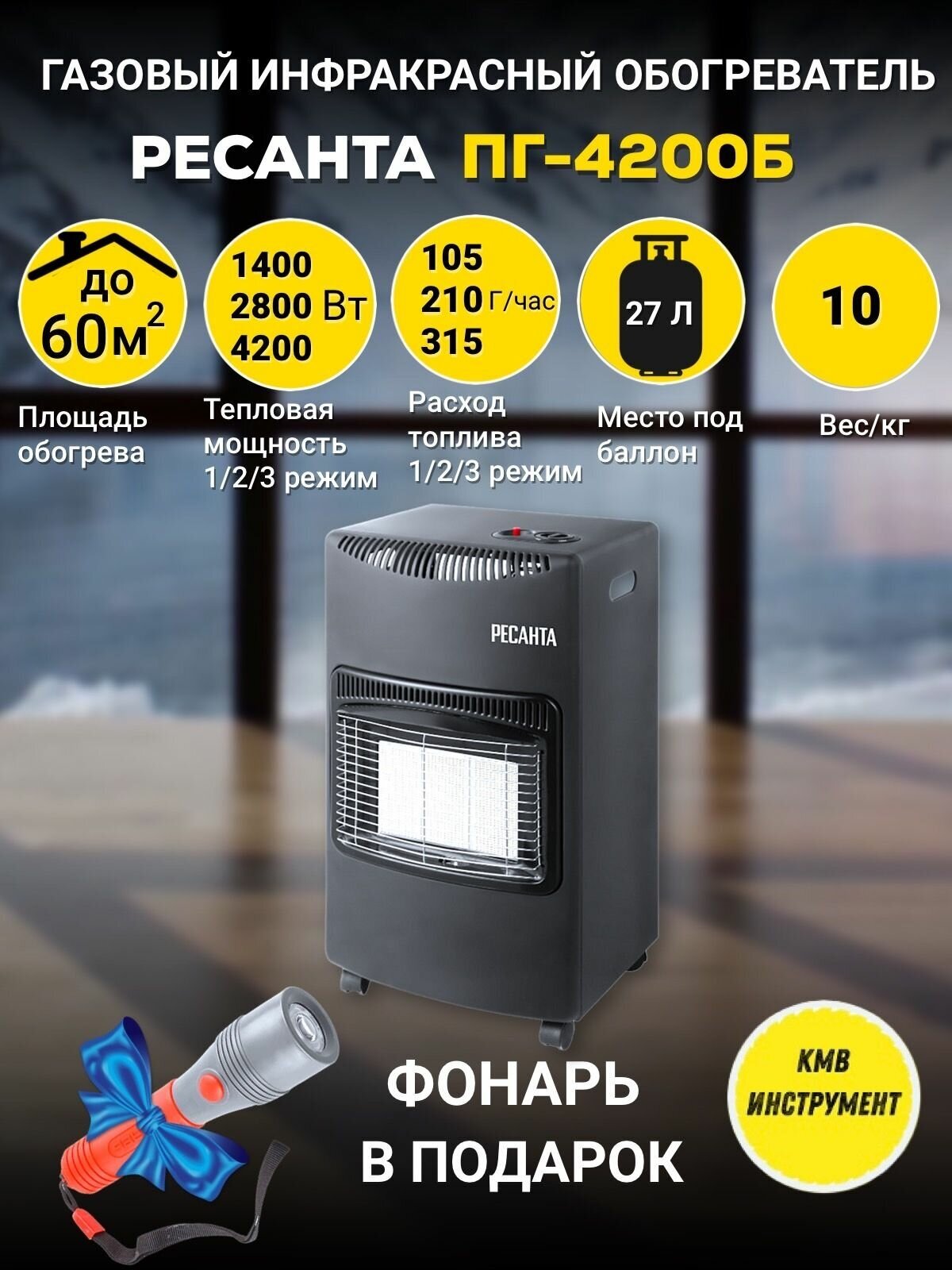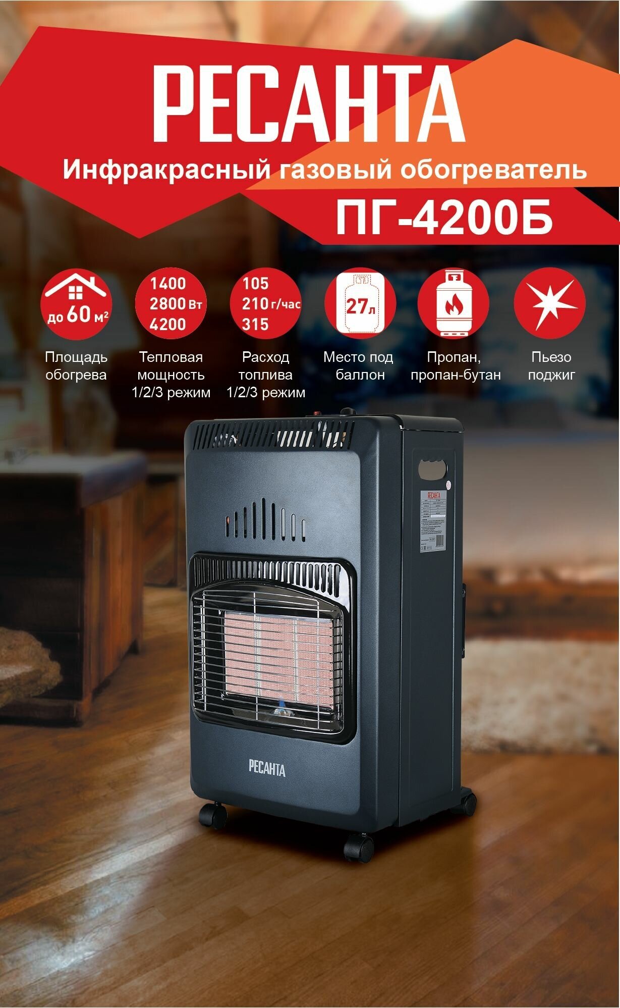 Gas heater type: oven, heating area: 60 m², heating power: 4.20 kW, heating type: infrared heating, security systems: gas control, tip-over shutdown, CO2 level control system, weight: 6.30