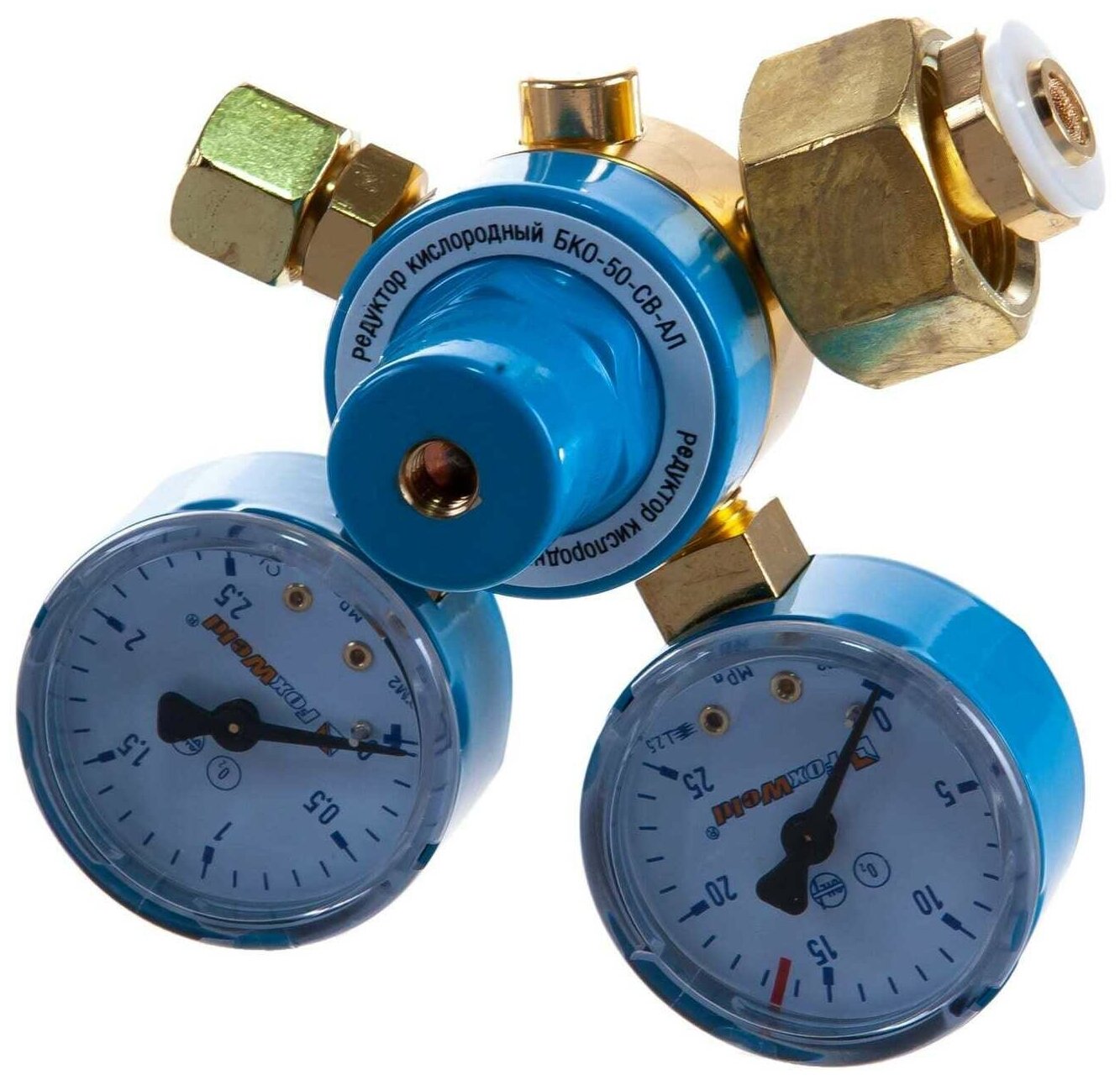 Type: reducer, type of gas: oxygen, maximum throughput: 50 m³/h, features: pressure gauge, safety valve, with union nut, installation location: cylinder, minimum outlet pressure: 0.02 MPa, max.