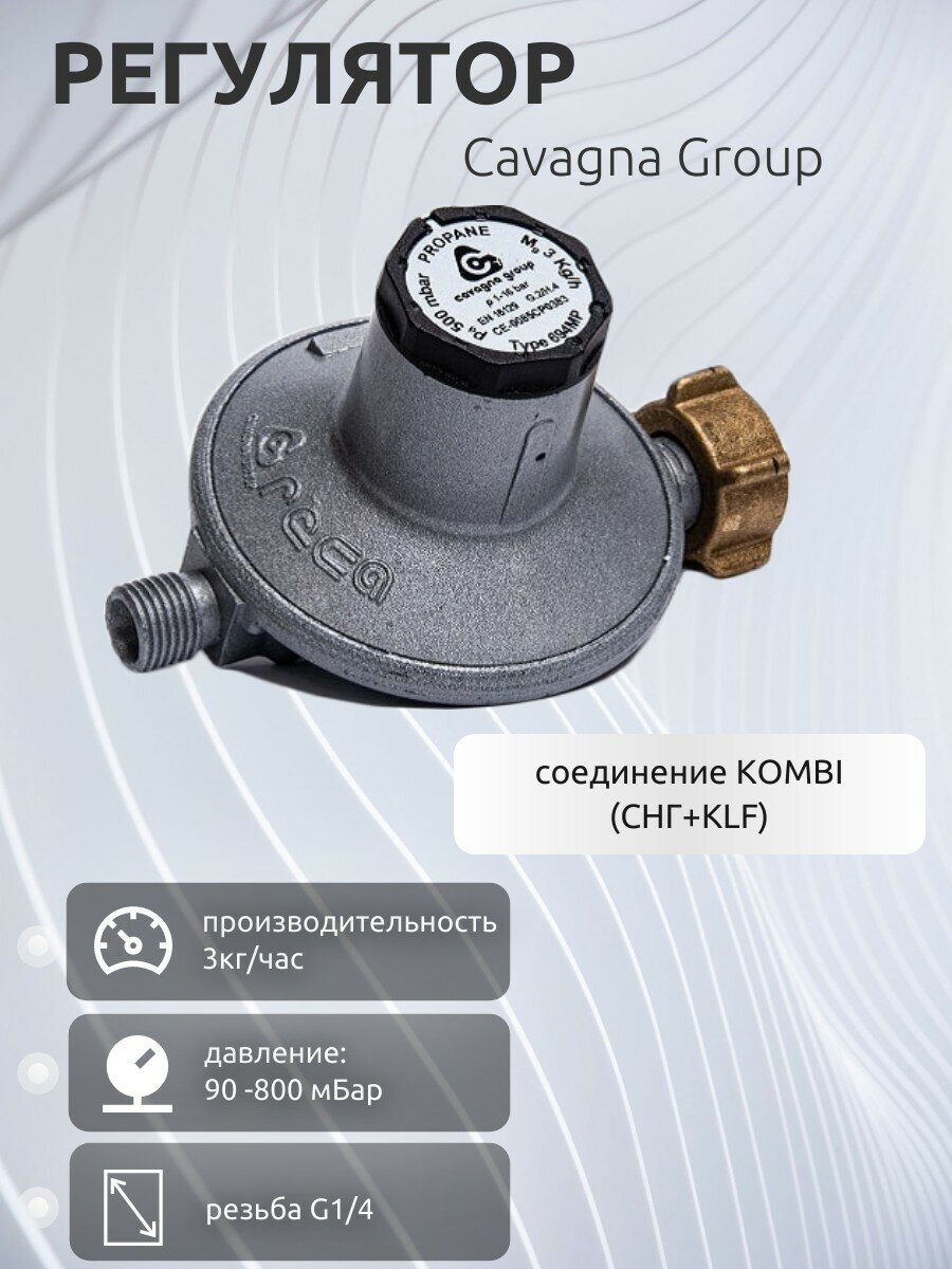 Type: reducer, type of gas: propane, maximum throughput: 5 m³/h, features: pressure gauge, safety valve, with union nut, installation location: cylinder, minimum outlet pressure: 0.01 MPa, maximum