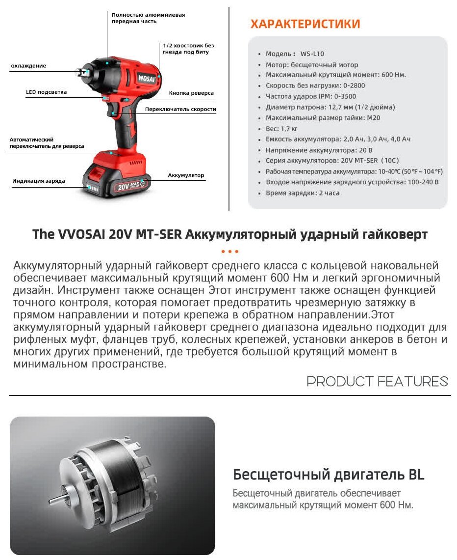 Wrench, battery - 1 pc., charger - 1 pc., instructions - 1 pc., branded cardboard packaging with a seal