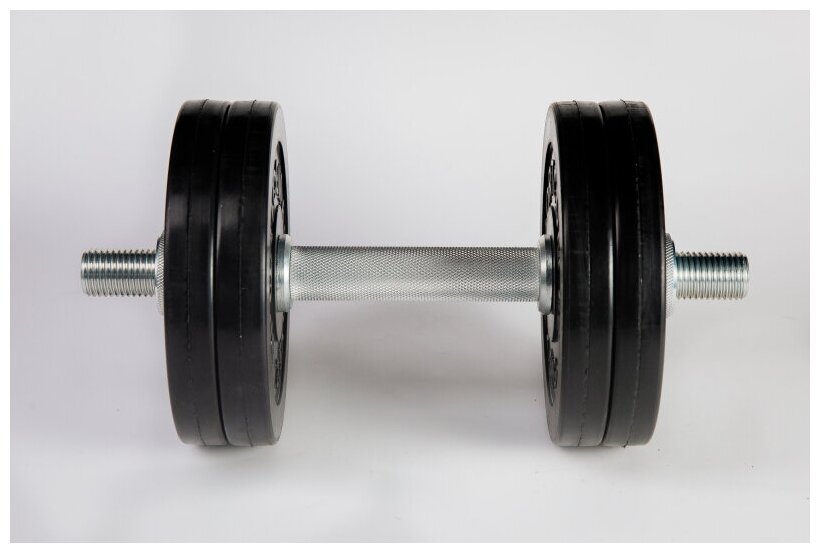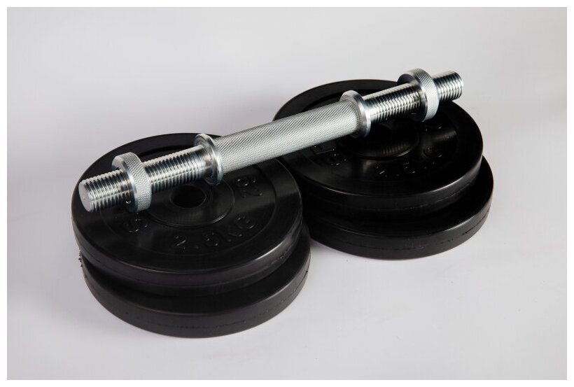 Type: dumbbell, design: collapsible, dumbbell shape: round, features: elongated, neck lock: nut, disc coating: rubber, handle coating: rubber