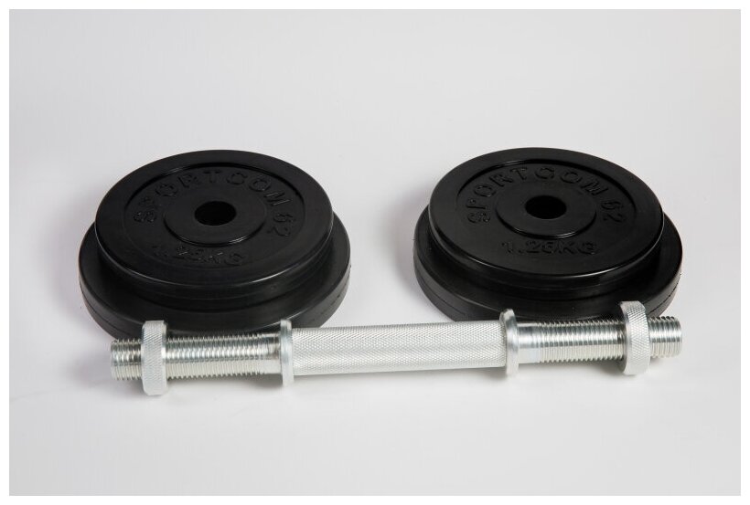 Type: dumbbell, design: collapsible, dumbbell shape: round, features: elongated, disc coating: rubber, handle coating: rubber
