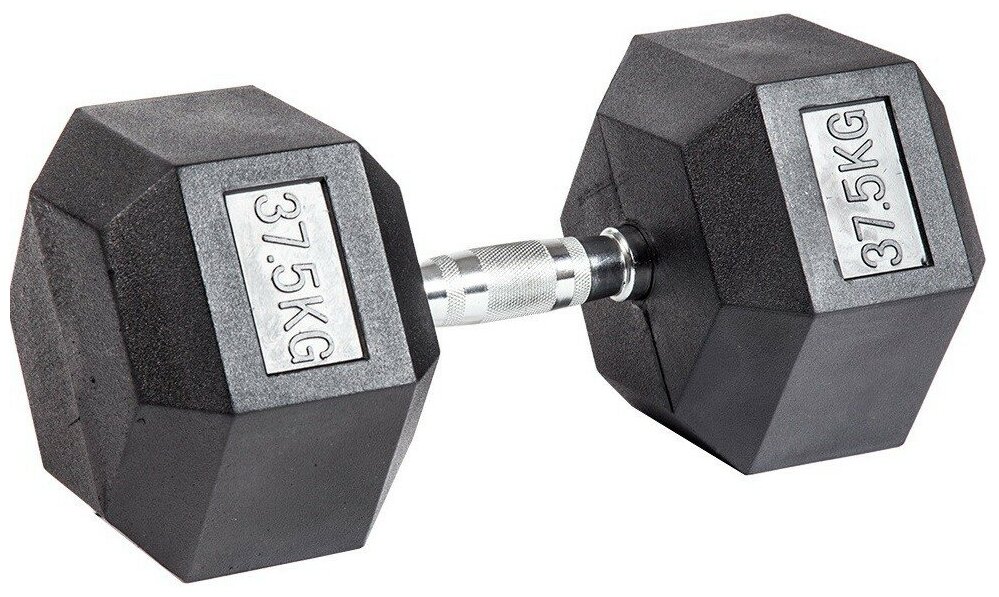 Type: dumbbell, design: non-separable, dumbbell shape: hexagonal, disc coating: rubber, handle coating: chrome