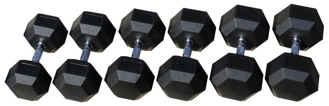 Type: dumbbell, design: non-separable, dumbbell shape: hexagonal, disc coating: rubber, handle coating: chrome