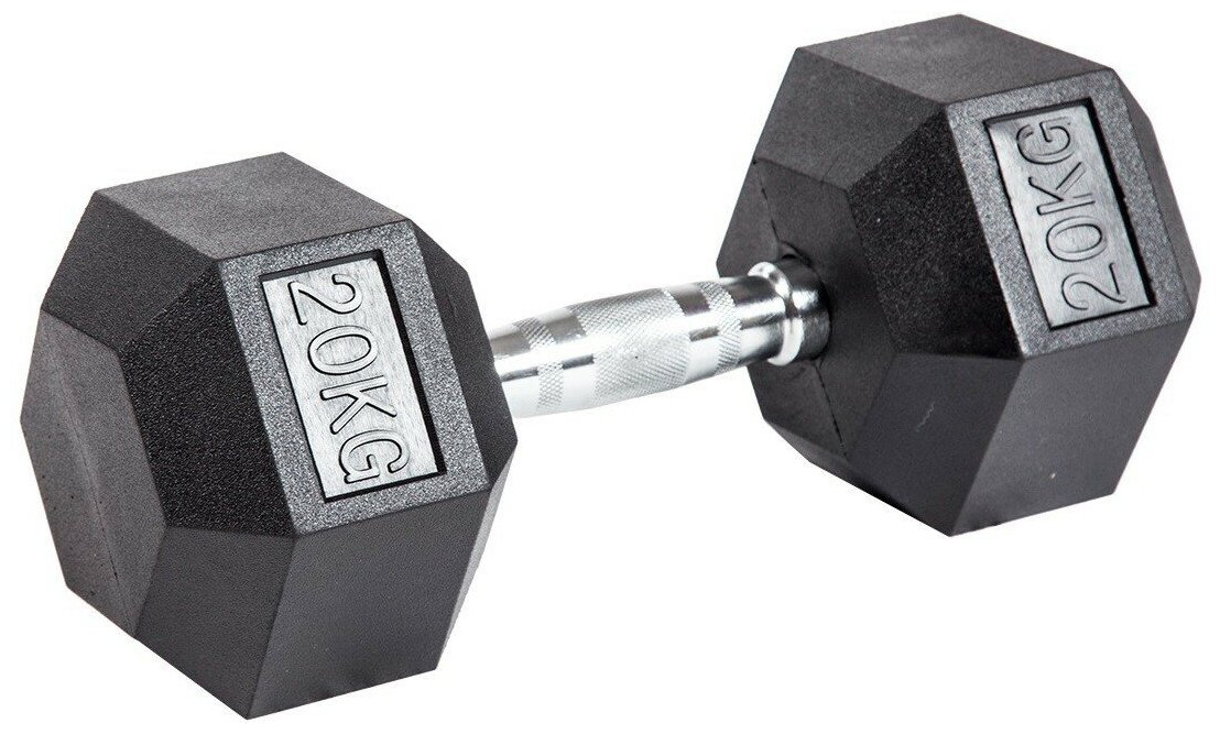 Type: dumbbell, design: non-separable, dumbbell shape: hexagonal, disc coating: rubber, handle coating: chrome