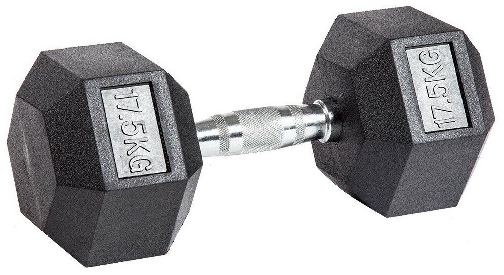 Type: dumbbell, design: non-separable, dumbbell shape: hexagonal, disc coating: rubber, handle coating: chrome