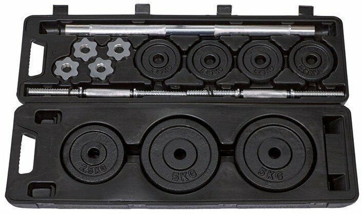 With the help of a separate neck, 2 dumbbells are assembled into a barbell; neck material: steel; neck diameter: 2.5 cm; dumbbell neck: 2 pcs, screws for the neck: 4 pcs, discs: 8 x 2.5 kg, 4 x 1.25 kg, 4 x 0.5 kg, barbell bar, case