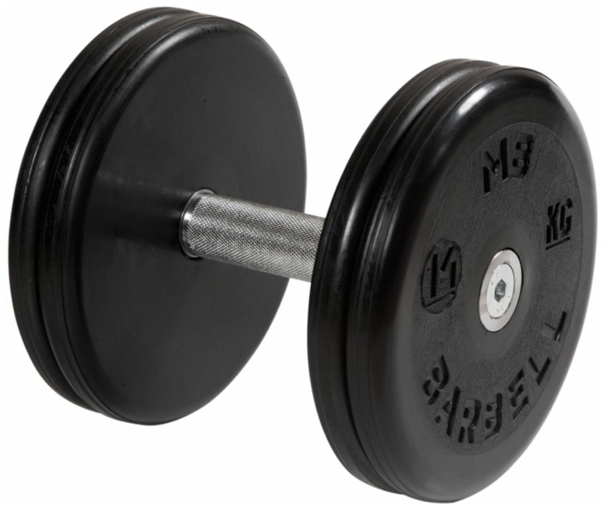 Description: Type: dumbbell, design: non-separable, dumbbell shape: round, features: Handles are made with a complex galvanic coating of nickel and chrome., disc coating: rubber, handle coating: chrome