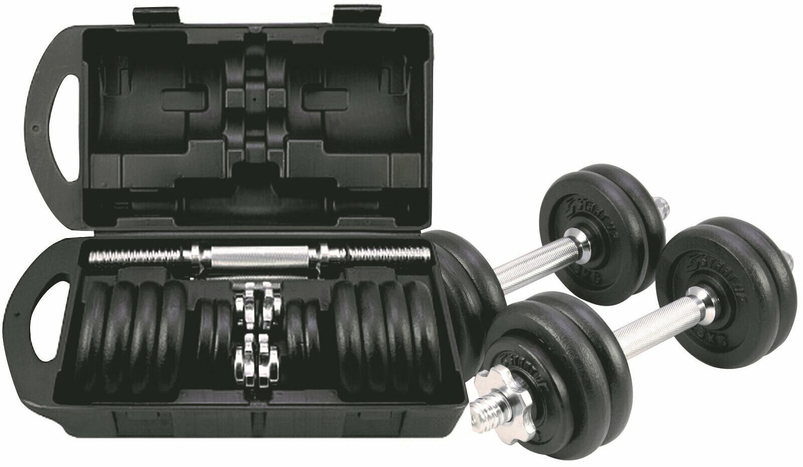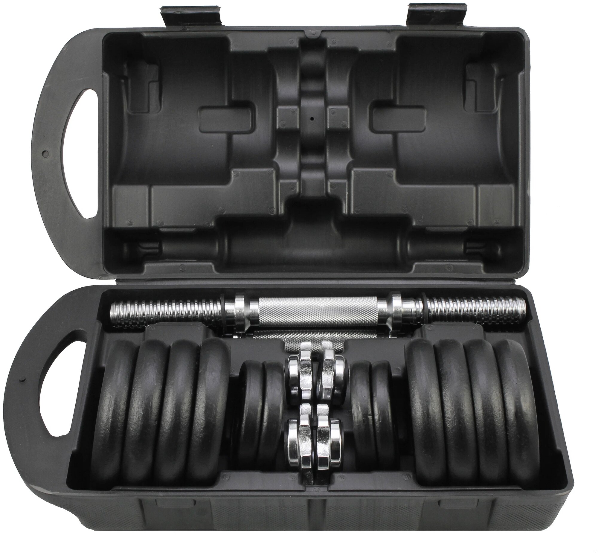 Equipment: Dumbbell neck: 2pcs, neck nuts: 4pcs, discs: 4 x 0.5 kg, 8 x 1.25 kg, case