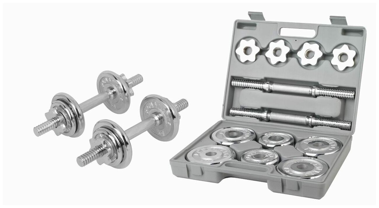 Type: dumbbell, design: collapsible, neck lock: nut, disc coating: chrome, handle coating: chrome