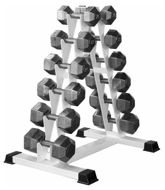 Type: dumbbell, design: fixed, dumbbell shape: hexagonal, disc coating: cast iron, handle coating: cast iron