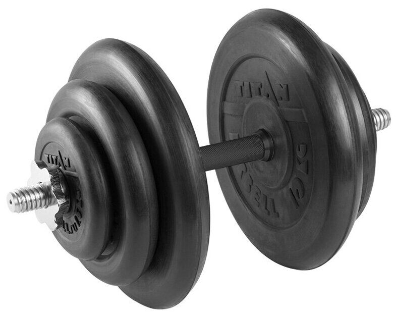 Type: dumbbell, design: collapsible, dumbbell shape: round, neck lock: nut, disc coating: rubber, handle coating: rubber